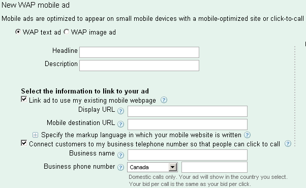 To target mobile phones that don’t have full internet browsers, then you will want to create a WAP Mobile Ad within your campaign. With WAP mobile ads you will have fewer characters to get your message across. What this means is that you will need to get to the point very quickly. Below is what you’ll be working with for your WAP mobile ad.