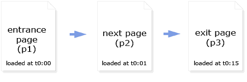 p1’s time stamp is 0:00, and p2’s is 0:01, so the time on p1 must have been 0:01. P3’s was loaded at 0:15, so the time on P2 must have been 0:14 (time it was loaded of next page, minus the amount of time spent spent on the page before). Sensible, no? Except, what about your last page? With these calculations the time on the last page is never counted.