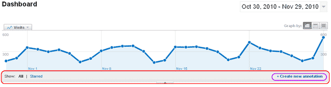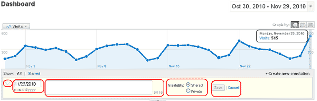 Google Analytics has a solution for this problem and it is called Annotations (for charts). Annotations are a very powerful tool for the web analyst, and one that is very under utilized (even when people actually use it). Google Analtyics’ Annotations allow you to add up to a 160 character explanation of an event or happening for a specific day. If need be, and trust me you should often need to, you can add more than one Annotation per day.