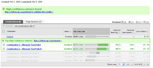 On March 9th, 2009 we launched an A/B/n conversion rate optimization experiment, where we matched the original test page against 5 other variations. Within 24 hours Google Website Optimizer had declared a winner that had a 98% chance of beating the original with a 116% observed conversion rate improvement. We were very excited about the results, and the speed with which we were able to achieve them.