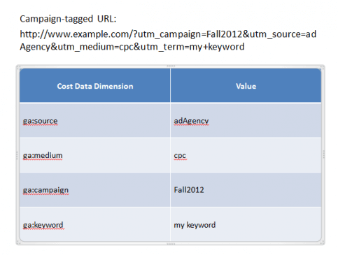 Note that for your visit data to match up to your cost data, you will need to make sure that the campaign dimension values from your ad platform matches the URL-decoded utm parameter campaign values exactly (You are campaign tagging all of your ads right?). If you don’t, you won’t be able to match the cost data to the visit data.