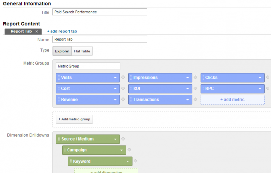 Now that the data is in GA, you’ll want to be able to see a report with this data. Unfortunately, a built-in set of reports is the one thing missing. Instead, you’ll need to create a custom report. Below is a screenshot of one I created. If you’d like to create this report in your own profiles, simply click this link: Paid Search Performance.