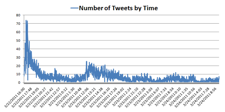 Finally, rather than studying the sentiment of the tweets, we chose to look at the volume of tweets over the time period to see how long the conversation remained highly active. Overall, it was a quick burst during the budget announcement with a relatively quick drop within a few hours. The following day showed a small blip of interest, and flattened out quickly as seen in the graph below.