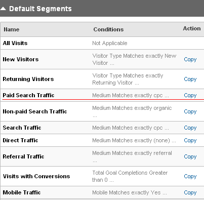 This one is a little more difficult. You may want to start by clicking “manage custom segments”, opening the “default segments” drop down, and copying paid Search Traffic