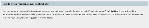 “You can stop message notifications (sent out when you get a message) by logging on to POF and clicking on ‘Mail Settings’ and selected the appropriate options. Unfortunately, you cannot stop receiving the latest matches emails usually sent out on Mondays – if these are a problem we can remove your account upon request by clicking HERE.”