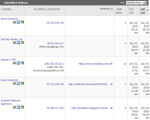 I don’t have access to their $3000 a month full program (nor even their $500 a month suite), but they do offer a freeVisitorIDservice. VisitorID reports on who is visiting your website. Once setup, it tracks each IP address that visits you, then combines it with whois information, giving you a business in most cases, and a name in some. Then it provides you with links to linkedin, Google, and Jigsaw, to expand what you know