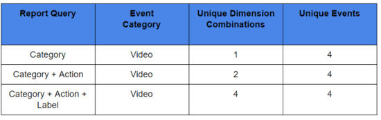 ‘Unique Events’, on the other hand, will always be the same regardless of the query structure. It always looks at the full event value (Event Category + Event Action + Event Label) even if some of the attributes are not included in the report. One example of what this means is that introducing a new value for Event Label will increment the ‘Unique Events’ count for the associated Event Category and Event Action even if Event Label is not displayed in the report. That is why in the table above there are always four ‘Unique Events’ returned regardless of the query structure.