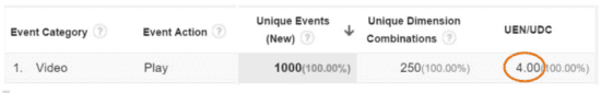 4. On average, how many unique video views are there per session? This is an example where having both ‘Unique Events’ and ‘Unique Dimension Combinations’ is useful. Create a custom report with the dimensions of ‘Event Category’ and ‘Event Label’. To make your life easier, you can add a Custom Metric that divides ‘Unique Events’ by ‘Unique Dimension Combinations’. In this example, an average of four videos are viewed per session.