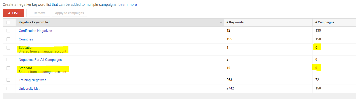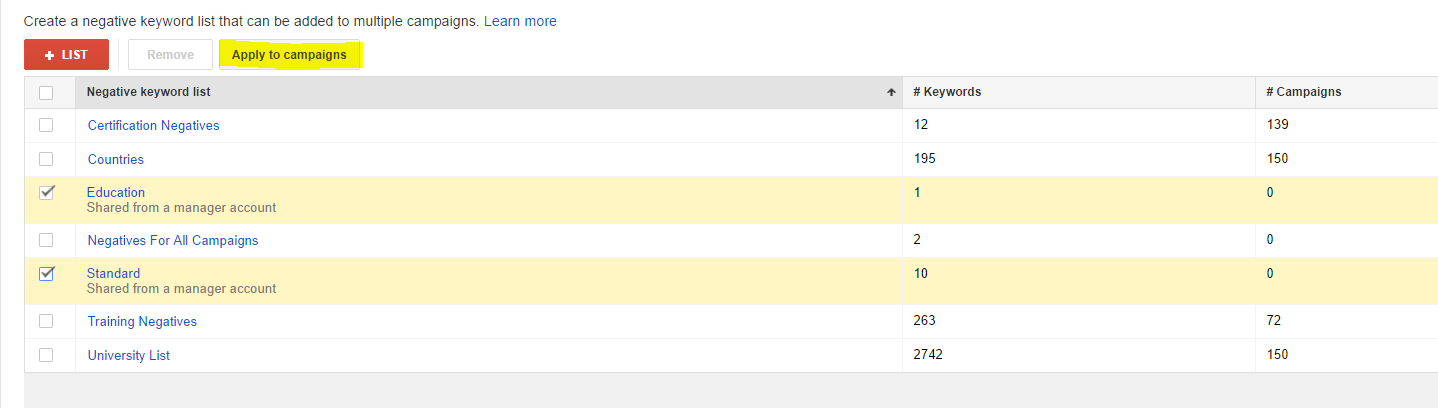 After creating your lists on an account level within Shared Library, you will now see these lists within each individual campaign and that they are being “shared from a manager account” but have not been applied to any campaigns as yet.