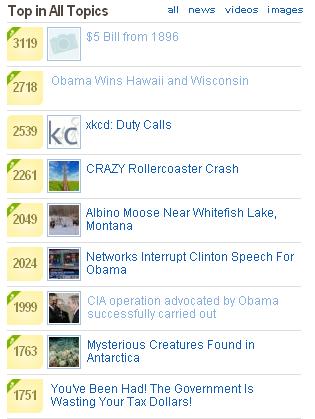 I’m not exceptionally witty and I personally hate Digg titles like “OMG COOLEST BILL EVER!” so I chose a simple and concise title that I thought spoke to the point: “$5 Bill from 1896”. Description? I copied and pasted one from Wikipedia and added little of my own input; “…looks pretty wicked”. Sure, it got a couple of diggs right away, nothing to get too excited about, so I dugg on and went to bed a few hours later. The next day at work I checked Digg’s front page [sorry boss] to find that my submission was the 5th most popular in all topics. An hour later it was #1, and stayed there all day long.