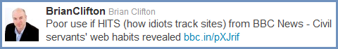 I am happy to see the Google Analytics site [second in the list] being visited by some government employees (Civil servants as they are called in the report), which gives me some hope that next year’s report will be based on more meaningful metrics rather than the useless number of Hits report.